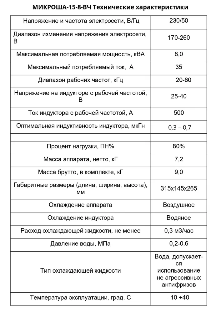 Кузнечный нагреватель МИКРОША-15-8-ВЧ имеет максимальную полную потребляемую мощность 8 кВА. Данная нагрузка достаточно приемлема для хорошей бытовой или гаражной электросети и МИКРОША-15-8 вполне вписывается в линейку этих аппаратов индукционного нагрева как по полной потребляемой мощности, так и по эффективности нагрева металла. МИКРОША-15-8-ВЧ имеет скромные габариты и массу всего 7,2 кГ, что значительно, в 3,5 раза, меньше аналогов, потому и называется «МИКРОША».
